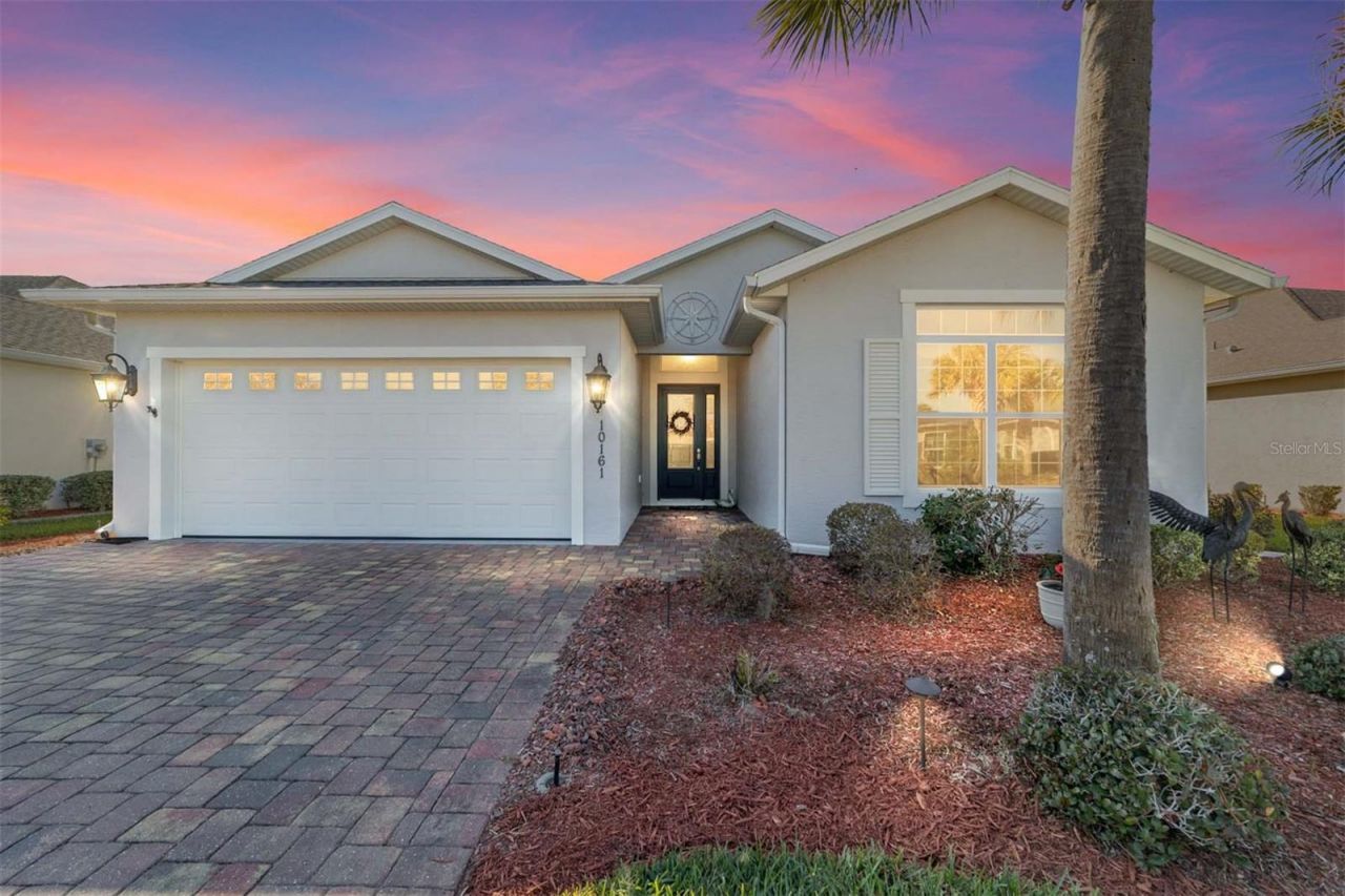 Gorgeous TURNKEY water-view home in the highly sought-after gated community of Lakeside Landings. This spacious open floor plan offers plenty of room for entertaining and hosting guests. One of the best locations in the area - just a 12-minute golf cart ride to Sumter Landing, 15+ minutes to Spanish Springs, and less than 10 minutes to everyday conveniences including grocery stores, medical and dental offices, Home Depot, Lowe's, Costco, the future Target, and more. The home welcomes you with mature landscaping, a maintenance-free lawn, STUCCO exterior, and a PAVER driveway and walkway. A large entryway with coat closet leads into an OPEN-CONCEPT layout featuring 12-foot ceilings in the main living areas and CERAMIC TILE flooring throughout, with carpeted bedrooms for comfort.The bright EAT-IN kitchen features Quartz countertops, STAINLESS STEEL appliances, and a large breakfast bar, making it ideal for casual meals and entertaining. The primary suite includes a 12-foot tray ceiling, TWO WALK-IN closets, and an en-suite bath with dual sinks on a Quartz-topped vanity, a linen closet, and a tiled ROMAN shower. A split-bedroom design offers three generously sized guest rooms, a shared bath, and an additional linen closet - perfect for guests or family.Relax and enjoy stunning sunset views from the screened lanai overlooking the pond. The backyard offers room for a pool. The 2-car garage provides space for both your car and golf cart, along with additional overhead storage. Inside, the large laundry room includes a utility sink, LARGE-CAPACITY washer and dryer, and extra cabinetry. The home is also pre-wired for a security system.The HOA covers exterior pest control, lawn care, and irrigation (including free lawn watering), making this truly maintenance-free living. Lakeside Landings is a fully gated community with impressive wrought-iron gates and resort-style amenities, including two pools, two in-ground Jacuzzis, a clubhouse with library and billiard room, FULL FITNESS CENTER, card room, putting greens, playground, basketball, tennis, and pickleball courts - all exclusively for residents. Kayak and enjoy the sunshine with access to Lake Miona. NO BOND!