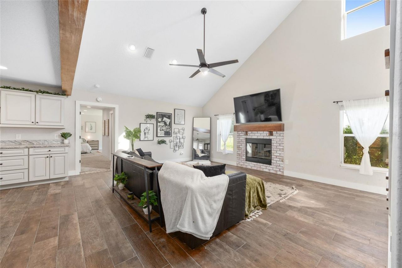 Welcome home to this mini farm country retreat! This custom-built Craftsman-style home sits on 2 peaceful acres and offers the perfect blend of elegance, comfort, and functionality. Inside, the open-concept design highlights a bright great room with a fireplace, perfect for relaxing or entertaining. The spacious kitchen features beautiful wood cabinetry, a large island, and plenty of workspace for cooking and gathering, truly the heart of the home. In addition to three bedrooms, there's a flex room that makes an ideal office, hobby room, or den, giving you options to fit your lifestyle. With two primary suites, each with its own en-suite bath and walk-in closet, plus a guest bedroom, there is space and privacy for everyone. Step outside to an expansive screened patio ideal for outdoor dining and gatherings, overlooking the sparkling pool and spa beyond. Enjoy the tranquil setting with an outdoor shower and fully fenced acreage, perfect for pets, horses, or simply peaceful country living. Equestrians and hobbyists will love the two-stall stable with a tack room. At the same time, the 900 sq ft metal building offers incredible versatility, ideal for RV or boat storage, a workshop, or a studio. The home's metal roof, thoughtful craftsmanship, and serene surroundings make it both low-maintenance and high-quality. Located just 7 minutes from all The Villages has to offer, yet tucked in a quiet area that's central to several cities, this mini-farm delivers the best of both worlds: country serenity with modern convenience. Schedule your private showing today and experience peaceful, fenced-in Florida living at its finest!