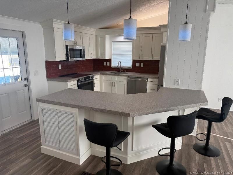 Adorable refurbished and updated home has it all. Custom built white shaker cabinets & large island with new bar stools, solid surfaced counter tops in kitchen with glass subway tile back splash. All new GE upgraded stainless steel appliances with original warranty. Guest bathroom remodeled with large porcelain tiles, new tub, brush nickel fixtures. white shaker cabinets, solid surface counter tops & and led mirrors. Master bath room remodeled with large format porcelain tile, real onyx stone floor & niche brushed nickel fixtures, white shaker cabinets, solid surface counter tops & led mirror medicine cabinet, premium glass shower doors & waterproof flooring, Home has new laminate flooring and new carpet in bedrooms. three walk in closets with custom built shelves & chrome finished rods. Interior completely painted , new brush nickel hardware on all doors, Lovely large screen room freshly painted floor and patio set. Over size storage she with Samsung washer & dryer .