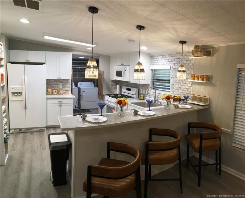 This home is like walking into a HGTV show A great location near pools and club house, shuffle board, tennis courts, boccie ball court, close to work out area, library, pool table, and much more. This home has been completely refurbished and modernized. New metal roof, new A/C. Inside new flooring, lovely open Kitchen new cabinets, counter tops and bar area, new appliances including gas range. Interior of home gorgeous nicely painted and newly furnishings with accent pieces , recessed lighting. propane generator included. A joyful spacious Florida room furnished to make this a relaxing happy place.