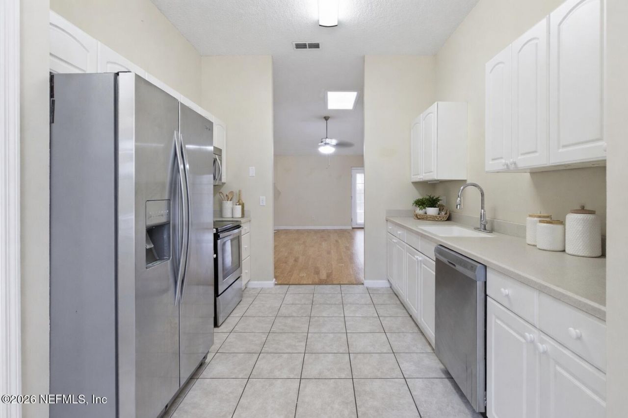 Tucked away on a quiet cul-de-sac on Jacksonville's Northside, this inviting home offers space and privacy, with low HOA fees and no CDD fees. A light, bright, and airy layout provides plenty of room to spread out. The galley-style kitchen flows easily into the living areas and includes an oversized walk-in pantry. Natural light pours into the family room through a skylight, while the wood-burning fireplace creates a cozy focal point. The spacious owner's suite features vaulted ceilings and a large walk-in closet, creating a relaxing retreat. Step outside to a large covered patio and fenced backyard with no rear neighbors. The extended garage offers extra storage and includes a work bench for projects or hobbies. Conveniently located near River City Marketplace, hospitals, and downtown Jacksonville, this home blends comfort, privacy, and accessibility in one exceptional package. Don't wait, schedule your private tour!