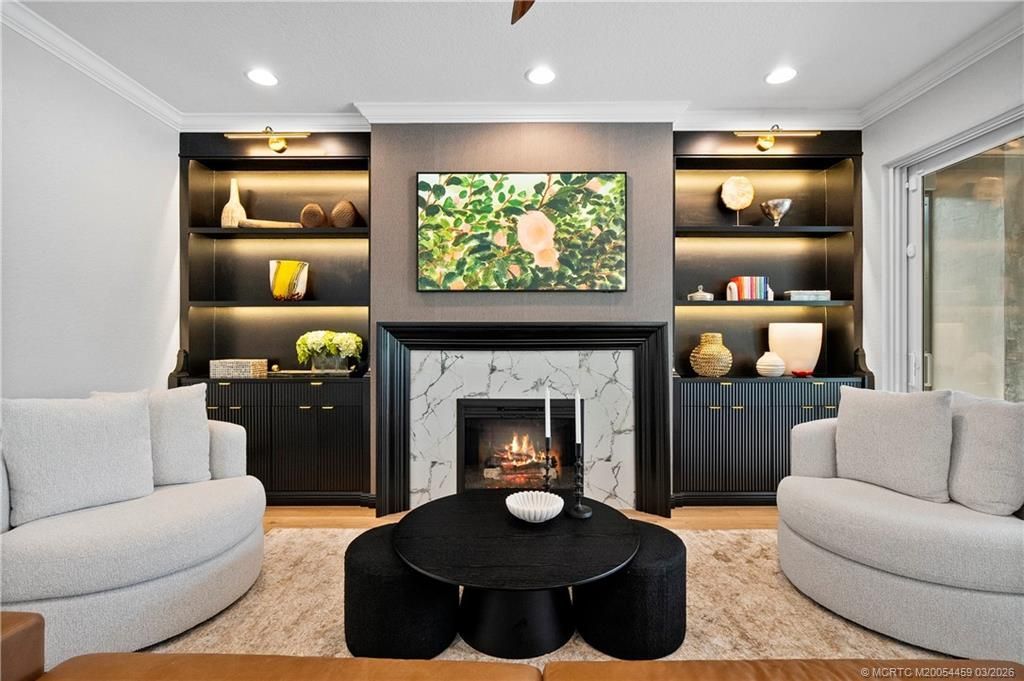 This beautifully upgraded concrete block home in Banyan Bay offers 3 bedrooms and 2.5 baths with designer finishes throughout. Highlights include custom accent walls, upgraded lighting, crown molding and a new impact-glass front door. The chef's kitchen features quartz countertops, stacked cabinetry, new appliances, a stylish hood and upgraded faucet, opening to a spacious great room with a beautiful built-in accent wall with a fireplace. The primary suite offers two custom walk-in closets, dual sinks and an oversized spa-style shower. Enjoy a private backyard retreat with a covered porch, retractable screen and fireplace overlooking the travertine deck, heated saltwater pool and pergola when you'd like to rest in the shade. The entire home is enhanced with crown molding, plus upgrades such as custom stair railings offer unique elegance. Complete impact glass and a flat-tile concrete roof provide lasting peace of mind. Perfect for entertaining and everyday comfort in a prime location.